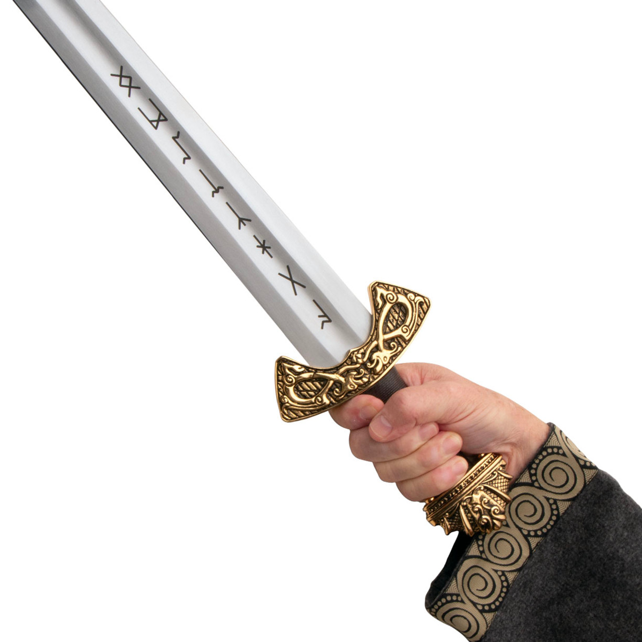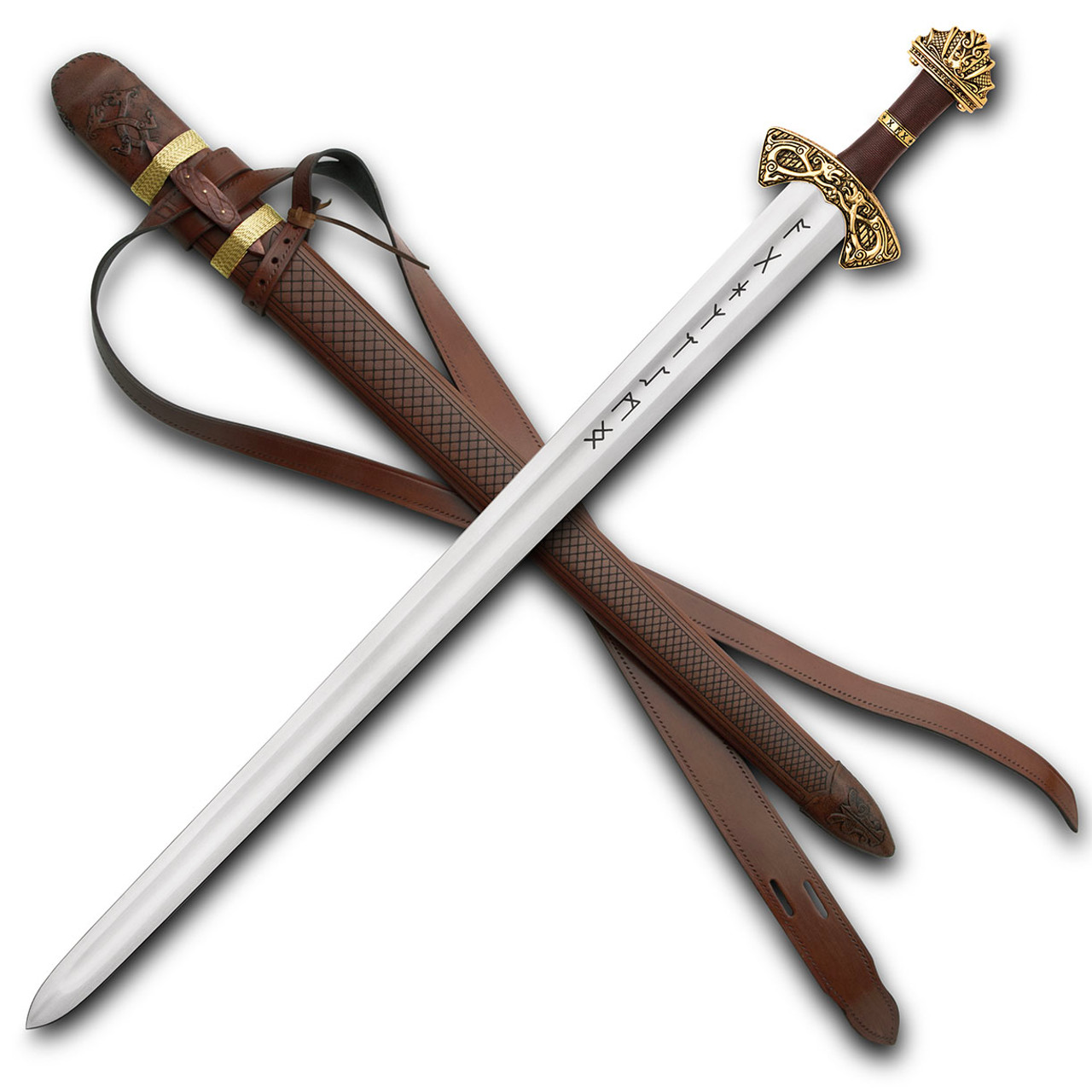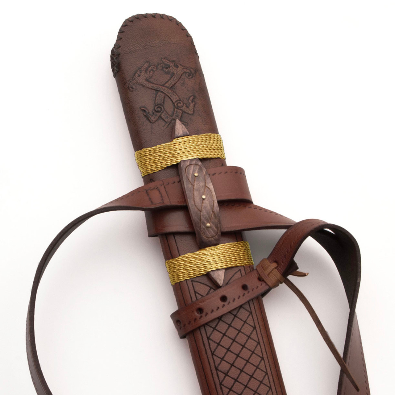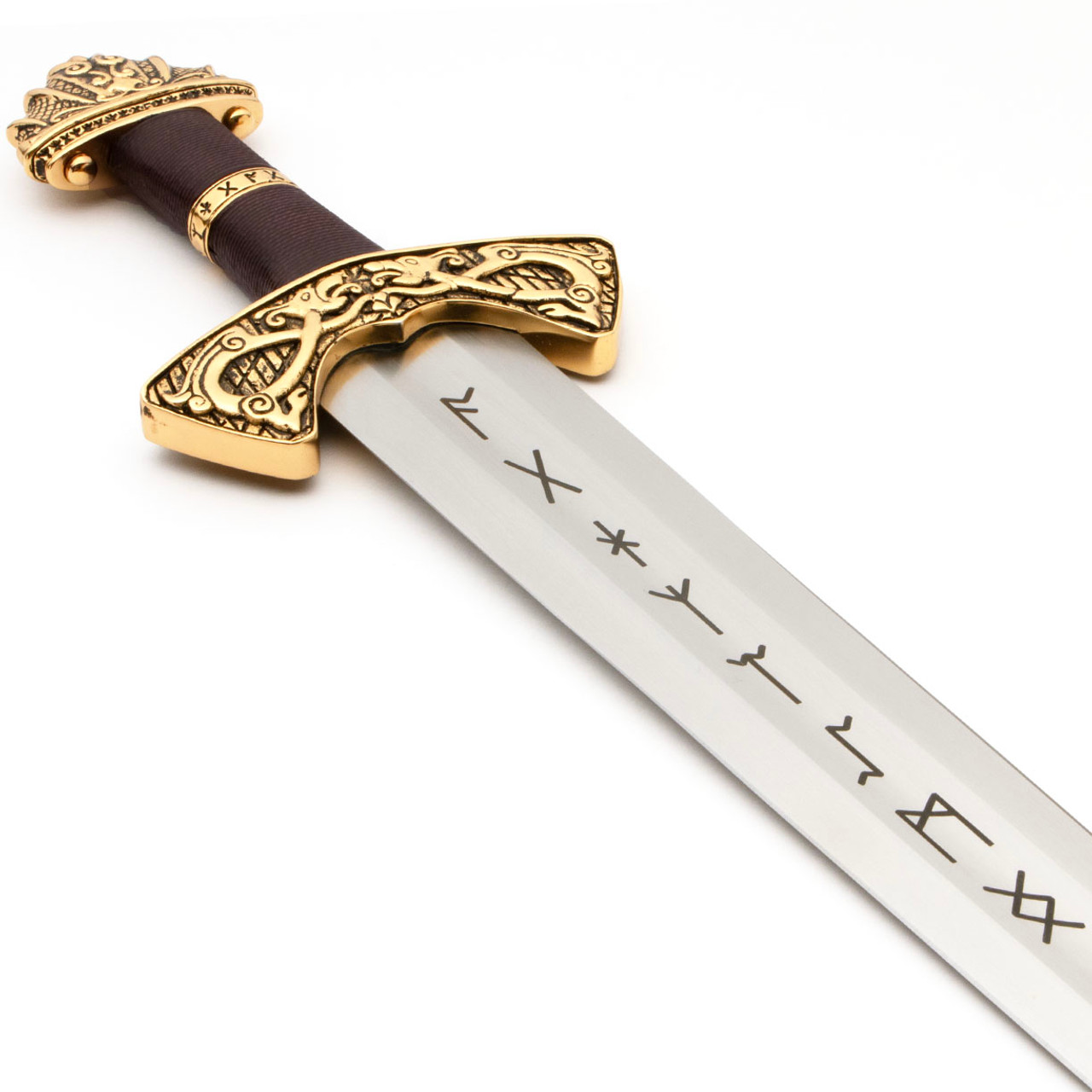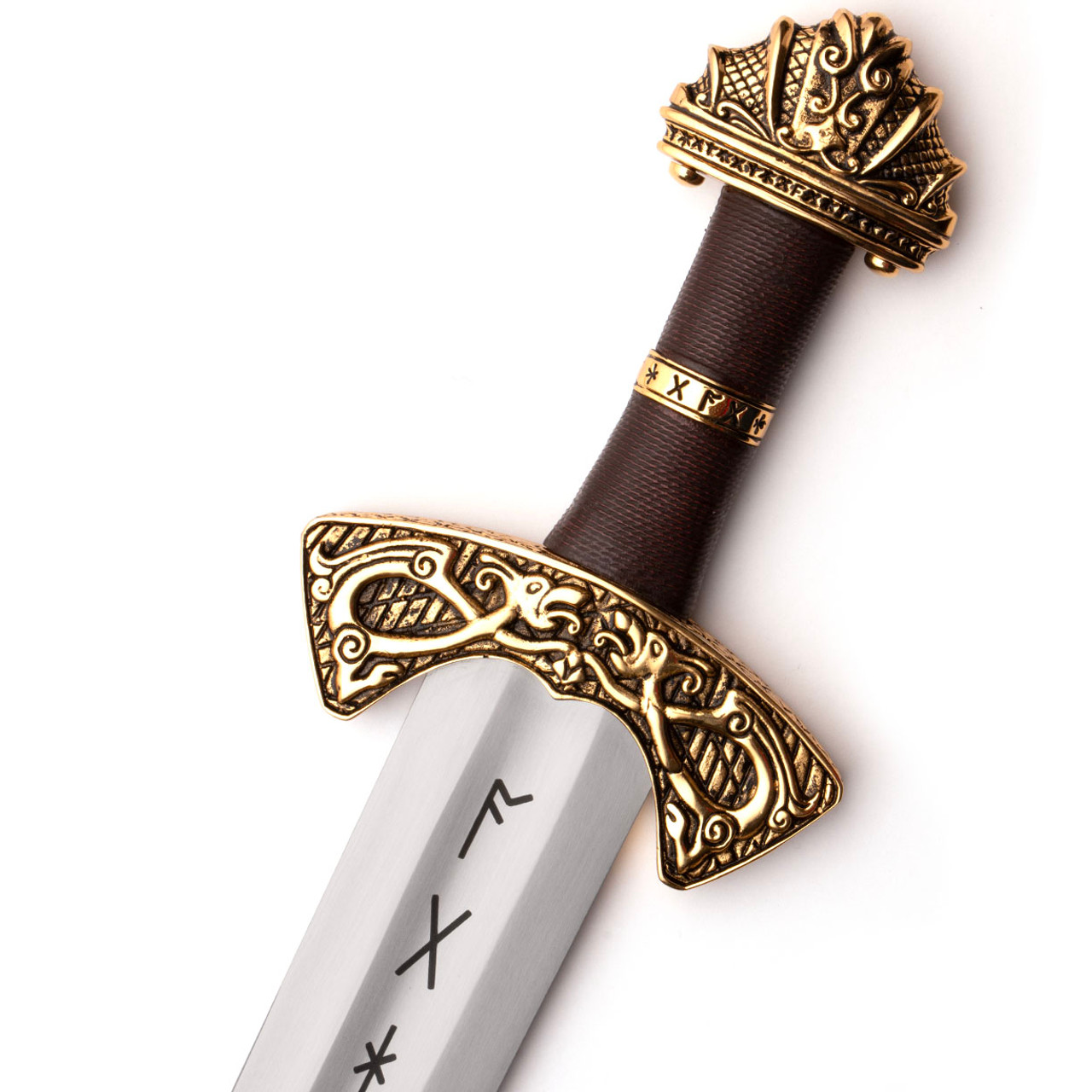 Runes representing “protection”, “oak”, “gift”, “fire” and “serpent” adorn the blade, bottom of the pommel and brass collar on the leather grip.