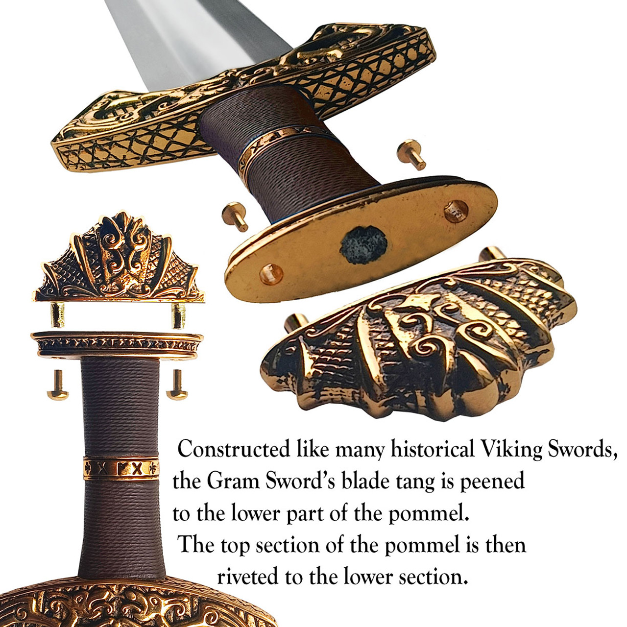 This sword is designed to evoke the spirit of the legendary dragon slaying weapon. The original sword of myth was described as “all decked with gold and gleaming bright”. Alas, we used gleaming brass for the pommel and guard, to keep this weapon attainable for mere mortals. The pommel has an imaginatively rendered dragon head inspired by multiple eras of Norse paintings and carvings. The guard features a pair of symmetrically opposed dragons. The crevices are stained to bring out the elaborately sculpted details.