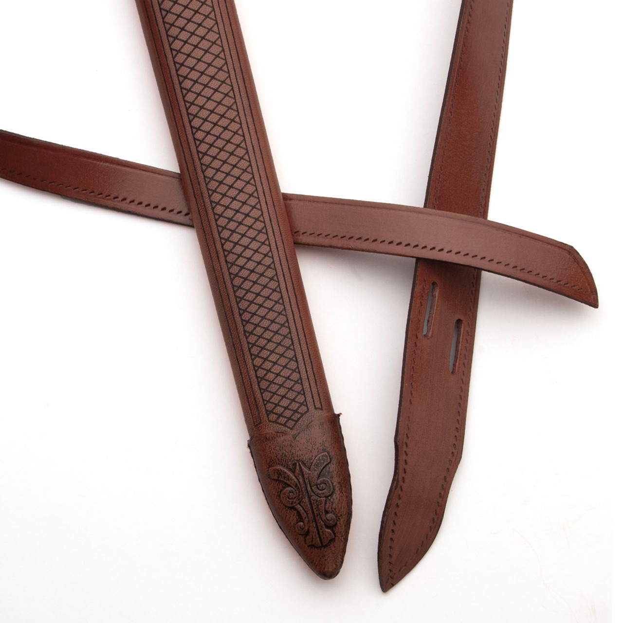 The leather lined, wood scabbard is beautifully embossed with dragons and features a wood belt holder secured with twisted brass wire wrapping. The leather has an aged, distressed finish befitting a sword that’s been around a few centuries. A matching leather belt is included.